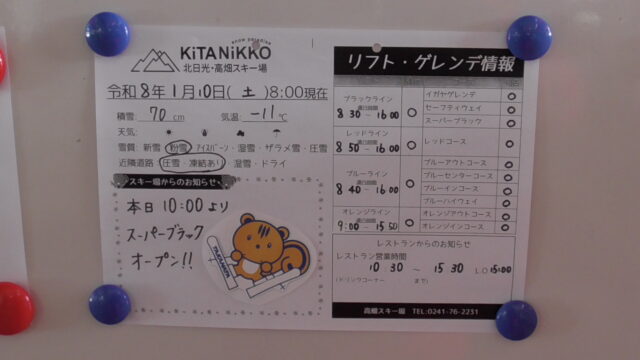 お食事 / スキー / 高畑連休、2日目 2026年1月11日 - Leave a Comment 確かに16時までだな。 始発行列。 朝イチはオレンジへ。 急斜面、また薄くなってたよ😔。 オレンジアウトも要注意だ。 そして、ブルーハイウェイ。 この3コースをぐるぐる😀。 ハイウェイではカモシカ(教えてもらった)。 食べたのはチキンだけどね😅。 午後は、あまり滑らないうちに荒天なっちゃって、早々に撤収したよ🥴。 明日も心配。