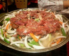 梅田の駅ビル(ちゅ~か、ガード下)2Fの韓国料理「釜山」にて(写真は調理開始直後のもの)。
