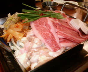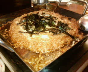 お食事韓国風すき焼き 2006年9月5日2025年9月23日 - Leave a Comment 京橋の韓国炉端「明月(ミョンウォル)」にて。 このあと追加でロースと野菜の盛り合わせを頼み、最後に「韓国風焼きご飯」(だったかな?、下の写真)も作ってもらい、ふたりでそれぞれ飲み物二杯で6,500円ほど。 おいしかったし、辛さも適度だったしで、また次の日もここでもいいかも~。