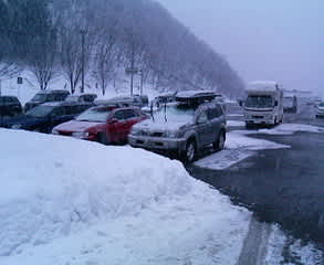 今週は、行きはひとりだったので、金曜の夜ではあったけどゆっくりめの出発。途中、蓮田と中山峠の手前とで仮眠。四時過ぎに目が覚めたときは雪が降りだしてた。ちょっとあせったけど五時には高畑に到着。