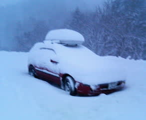 昨夜降ってくれればいいのに、ようやく朝から降りだしたらしい。夕方クルマに戻ったときで10センチ弱というところかな。