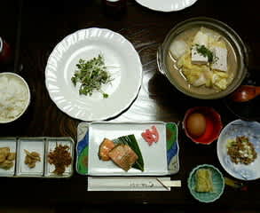 交替制の晩ご飯、6時の部はぼくら以外はかなりのエキスパートで、スキーの話になるとムツカシイこと言っててよく分からないものの、行く場所もないのでじっと耳を傾けていたけど、チビッコの部の仕度があるからと6時40分に解散~。