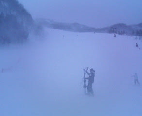 きのうの春スキー状態とはうってかわってきょうは雪。というより風の方が強かったけど。写真はいつもの会津高原高畑スキー場、夕方の猪谷ゲレンデ。