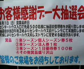 熱血スキーヤー火成岩さんのブログ「書を捨てよ、山へ行こう~since 2004.7~」によりますと、会津高原高畑スキー場の最終営業日4月1日(日)に大抽選会イベントが開催されるとのことです。