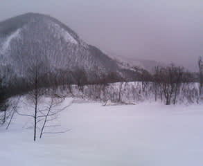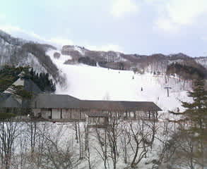 しげちゃんがやっぱり一緒に行ってくれるというので、2時に起きて支度、2時半に出発、途中で買い物とか荷物の積み替えとかしてて中野に4時。そのあと高速降りるまで運転してもらい、高畑に着いたのは7時半。途中、木賊への分岐を過ぎた頃から気が付いたら雪が降ってる、というかちょっと舞ってて、路面も雪が残ってるところが増えてたけど、高畑着いたら晴れてた。写真はセカンドハウスから見た猪谷ゲレンデとセンターハウス。