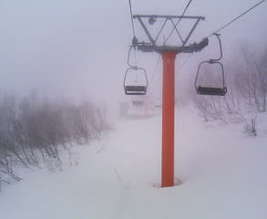 平日にかなり降ったらしいので期待したのだけど、金曜日に晴れちゃったのでふわふわパウダーではなく残念。とはいえ、オレンジインのリフト寄りは雪がそうとうに増えて、なんかなつかしいカタチのコースになってた。