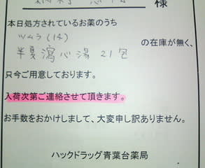 連休だったのでいつものシオダ薬局へは行かずに青葉台の大きなお店へ行ったんだけど、例の漢方薬が二週間分しか無いとのこと( ̄^ ̄)。