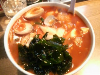いつもならこの時間帯にこの店に来るのはあり得ないんだけど、先週から風邪気味で、温まりたかったから。チゲにしてワカメ追加したのは種類増やして栄養摂ろうと思ったので。