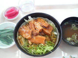 お昼はチキン照り焼き、うどの酢の物、おにぎり、薫製たまご。