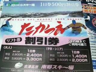 レジャー割引券 2008年11月5日2025年9月23日 - Leave a Comment 神田でもらってきた会津高原のパンフ(というか目当ては割引券)をしげしげと。 高畑が20日にプレオープンするとして、きっと土日しか営業しないだろから、月曜日にたかつえ、23日はだいくらで滑ろうかな、と。 まあ、雪が降らなきゃ始まらないけど。