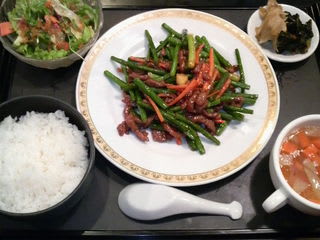平日限定のオーダーバイキングはちょっと高かった(2,600円)のでやめといて、ほんとは平日ディナーセットの方が安かったのだけど海鮮丼+ラーメンというのは食べられそうになかったので、「牛肉とニンニクの芽炒め」と「ライスセット」。