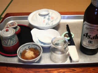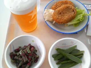 お昼は、祝勝会も兼ねてサッポロ生ビール、野菜コロッケ、山くらげ梅肉あえ、うど酢の物。
