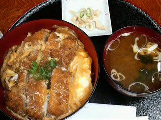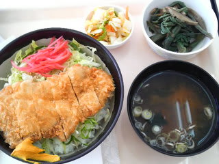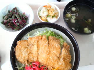 お昼は、必勝を期してソースかけないソースカツ丼と山くらげ梅肉あえ。。