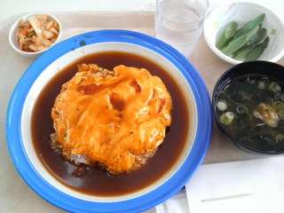 お昼はセンターハウスレストラン。天津丼、うど酢のもの。