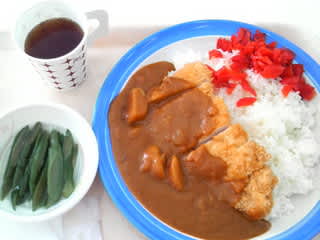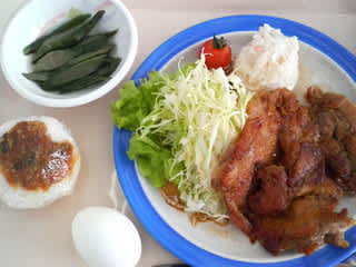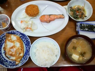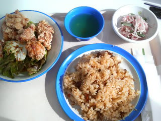 お昼は花木メニュー鶏唐揚げ、まいたけ飯、山菜。