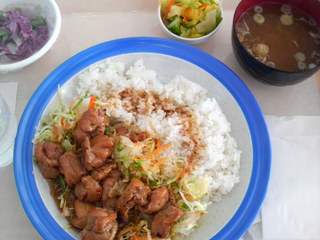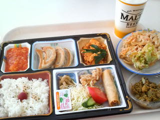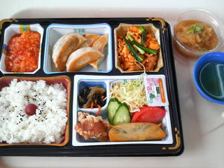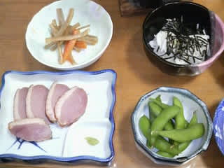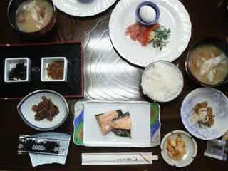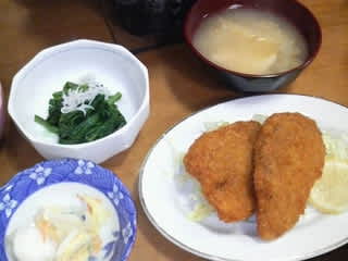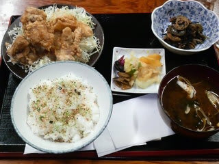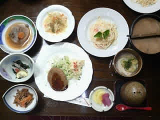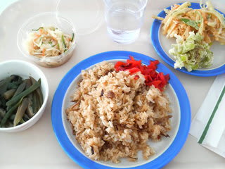 お昼は山菜二種、まいたけ飯、揚げたて(でも100円)てんぷら。