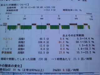 ただ、それにしてもそんなのが出るのは疲れているときらしく、睡眠の質を調べると一番長いのはうとうとの次の段階2が61%。その次の段階3が2%。ぐっすり熟睡の段階4はゼロだった(*ToT)。