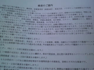なんか検査の案内を渡されたけど、生活習慣病と診断された場合、ということなのでスルーだな、きっと(^.^)。