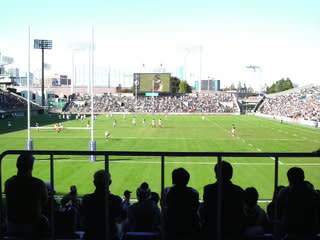 レジャーラグビー慶應戦 2010年11月3日2025年9月23日 - Leave a Comment 結局、朝の部は熊谷まで行ってしまったので、秩父宮は第二試合から。 今シーズン負け無しの4チームが揃うからか、見たことないような混雑ぶり。 それでもどうにかゴール後ろの上段、屋根席最前線に陣取れたのでよしよし(*^^*)。 試合は、いちおう終始リードで進んだけど、最後はかなりヤキモキ。 相手が横パス展開してくれたので、その勢いも利用して押し出したところでノーサイド(^.^)。 祝勝会は外苑前「鳥ぎん」。