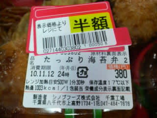 お食事半額 2010年11月12日2025年9月23日 - Leave a Comment 夕食を買いに寄ったスーパーでお値打品のお弁当を見つけた。 すげー安い。 思わず、予定外に明日の朝食用として買っちゃった。 早く帰れる日はスーパーに寄ることにしよう。
