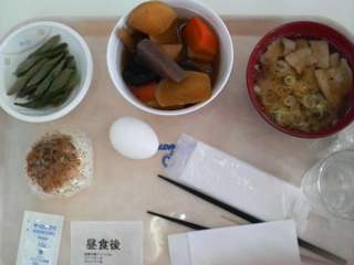 お昼はうどの酢の物、おばちゃんの煮物、豚汁、油味噌おにぎり、ゆでたまご。