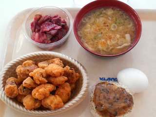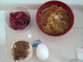 梅ザーサイ、豚汁、油味噌おにぎり、ゆでたまご。
