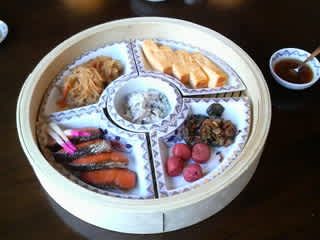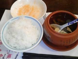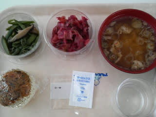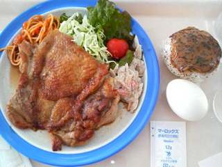 お昼はチキン照り焼き、油味噌おにぎり、ゆでたまご。