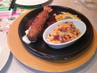 ハンバーグ海老フライ&ミートグラタンセット、850kcal(料理)+20kcal(サラダ)+330kcal(ごはん)。