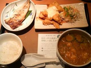 お食事冷汁ととり天南蛮の定食 2011年7月12日2025年9月23日 - Leave a Comment 外食産業応援シリーズ@青葉台「やよい軒」(^.^)。 ①まずはとり天南蛮でごはんをいただく ②食事のしめにアジをほぐしてごはんと一緒に冷汁に入れる って、ごはんの量を間違えると二食分食べちゃうな(少なめ頼んどいて良かった!)。 こりで季節メニューは制覇かな? (^_^;)