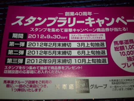 お食事スタンプラリーキャンペーン 2012年9月9日2025年9月23日 - Leave a Comment けっこう気に入っているお店だからスタンプカードあると言われてもらっちゃったけど、今月末までならたぶん次のも押せないと思うよ。