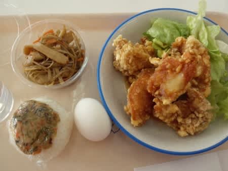 金平ごぼう、鶏唐揚げ、味噌おにぎり、ゆで玉子。