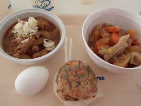 もつ煮、ざく煮風煮物、たまご、味噌おにぎり(150円に値上がり)。