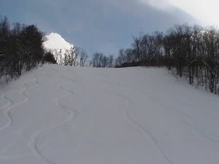 さらに上がると、さきほどレッドで新雪滑った跡が残ってたり。