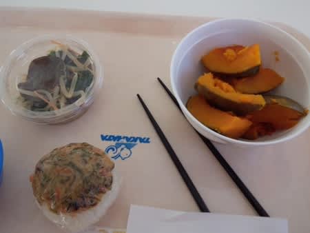 もやしキクラゲ、かぼちゃ煮、味噌おにぎり。