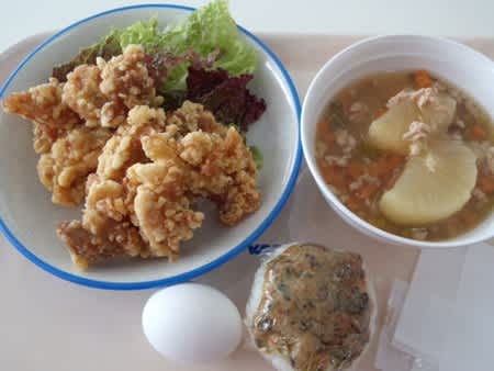 鶏唐揚げ、大根のつづら煮(だったかな?)、味噌おにぎり、ゆでたまご