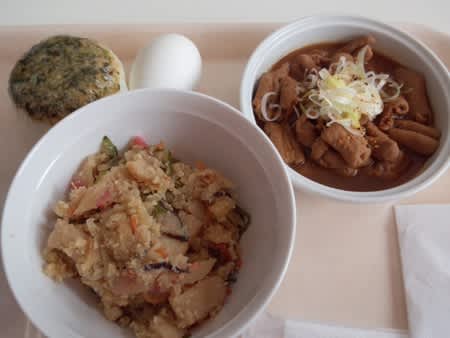もつ煮、味噌おにぎり、ゆでたまご@会津高原高畑スキー場・センターハウスレストラン。