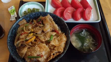 味噌炒め丼、冷やしトマト