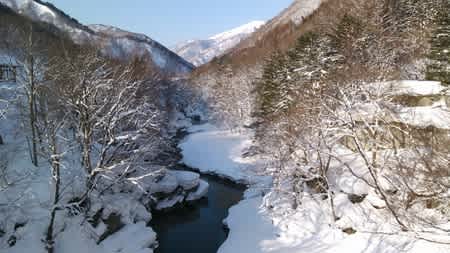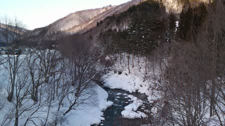 センターハウスへ向かう途中、橋の上から上流の檜枝岐方面の景色。