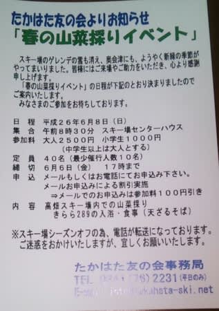 高畑「春の山菜採りイベント」 2014年6月2日2025年9月23日 - Leave a Comment はがき来た。 さっそくメールで申し込んだけど、なまえとケータイ番号だけで良かったのかな? —– ■会津高原高畑スキー場