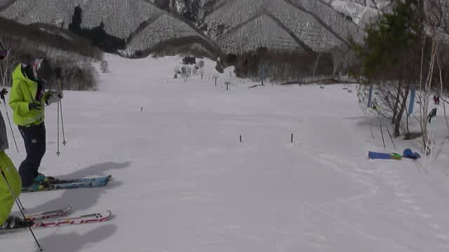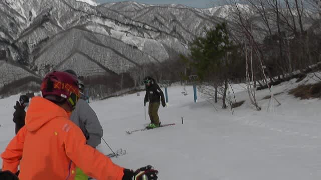 「上体が色んな方を向いている。フォールラインを意識するように。内足に乗れてなく、2本のシュプールになっていない。ストックを使って動きを止めないように。」