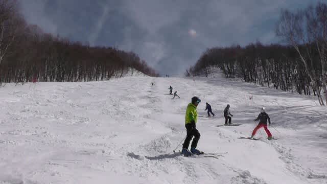 先週と同じラインを最初は考えていたけど、エキスパートがチビッコゲレンデ側を滑っていて、あちらの方が斜度がきついけど片斜面ではないことを確認してそちらを攻めてみた。