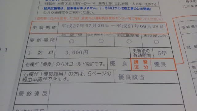 Weblog免許証更新 2015年7月29日2025年9月23日 - Leave a Comment 結局、1時間ちょい歩いて、最寄りのではなく隣の警察署へ。 駐車場あるじゃん(^_^;)。 最寄りのは駐車場無くて更新受け付けてなかったのかも(~_~;)。 懸案の視力検査。 最初のが大きいのにイマイチはっきり見えなかったけど、小さくなった残りのはちゃんと見えたので、あっけなく合格(^-^)v。 無事に裸眼で更新出来ました(^.^)。