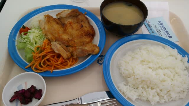 きょうのお昼は、さばのみそ煮を頼んだら前の人で終わってしまったので、チキン照り焼き定食。