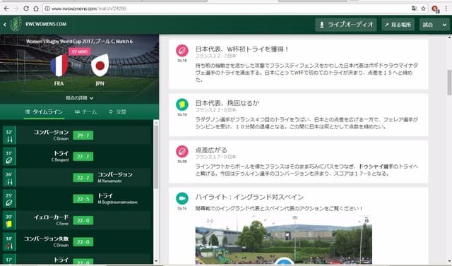 ラグビーフランス戦 2017年8月10日2025年9月22日 - Leave a Comment 女子ラグビーワールドカップ@アイルランド、第1日目。 ネットで実況サイト見つけたけど、得点シーンだけのテキスト(日本語)と音声(日本語じゃない)だった。 早起きしてみたけど、寝よ。