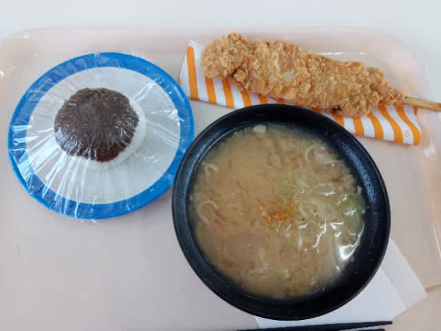 じゅうねんもち、豚汁、ジャンボロース串カツ。