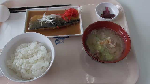 さばみそ定食豚汁、温泉たまご。