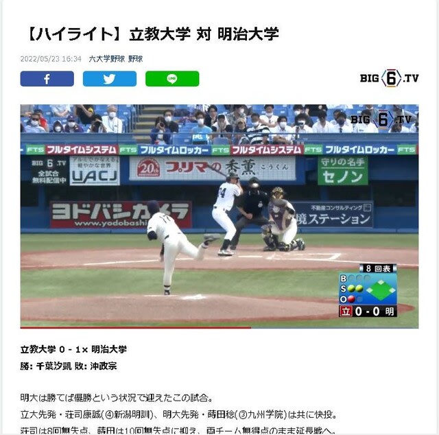 Weblog気が付いたら 2022年5月23日2025年9月22日 - Leave a Comment 優勝してた。 なかなか拮抗した試合だったようだ。 ハイライト動画。 立教は例の速球投手が出てきたんだな。 後が無いもんな。 そいつが投げてる間に点を取られなくて、良かったぁ。 観に行けたのは昨日の1試合のみだけど、優勝してくれて嬉しいです。 先週痛めた腰はまだイタいけど。