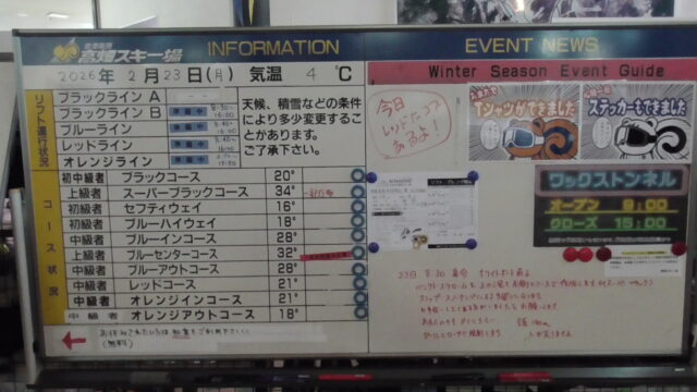 お食事 / スキー / 高畑天皇誕生日 2026年2月23日 - Leave a Comment 三連休最終日。 掲示板。 ブルーアウト規制。 始発行列。 朝レッド。 なかなかよっしー。 😀 朝オレ。 視界悪し😒。 いちおう早めにいただいた。 クビ痛いけど、コース整備ぐらいは出来るよ😉。 まあ、滑っちゃったけどね🙃。 投入したカーボンストック、 なかなか良かったよ👌。