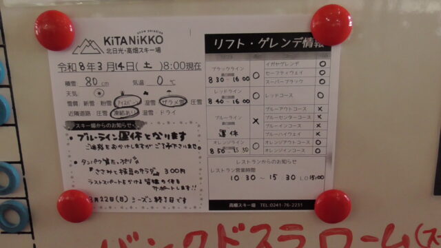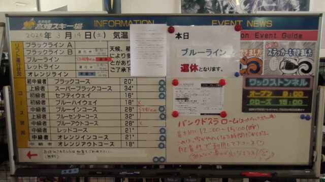 お食事 / スキー / 高畑明日は14番。 2026年3月14日 - Leave a Comment おはよー。 掲示板。 ブルーラインは運休😞。 朝レッド。 猪谷も滑る。 週末は早く出てくるな。 デコボコ。 硬い😣。 ラストオレンジ成功😀。 がんばろー。 p(^o^)/